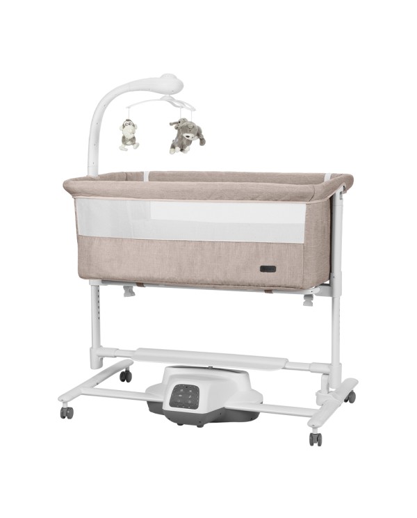 Cuna y mecedora 3 en 1 con ajuste de altura, control remoto para temporizador, modo balanceo y velocidad. La cuna ayuda a calmar al bebé y a mantenerlo dormido gracias a un sensor de movimiento integrado que activa el balanceo al ser molestado. Modo balanceo: La cuna ayuda a calmar al bebé y a mantenerlo dormido gracias a un sensor de movimiento integrado que activa el balanceo al ser molestado. Ajuste de altura: El colchón cuenta con 8 niveles de altura, que se seleccionan fácilmente mediante cómodas palancas. Esto permite colocar la cuna a la altura perfecta para alinearla con la cama de los padres. Lateral abatible: La cuna tiene un lateral abatible que permite usarla como cuna de cabecera para colecho. Incluye correas para sujetarla a la cama de los padres. Mosquitera: La cuna incluye una mosquitera para proteger al bebé de los insectos durante el verano. Utilizando el panel de control con indicadores luminosos o el mando a distancia, puedes seleccionar: * 7 modos de balanceo * 5 velocidades de balanceo * Temporizador de 8, 15 o 30 minutos Ajuste de altura (de arriba a abajo hasta el suelo): Posición 1: 80-48 cm Posición 2: 78-46 cm Posición 3: 76-44 cm Posición 4: 74-42 cm Posición 5: 72-40 cm Posición 6: 70-38 cm Posición 7: 68-36 cm Posición 8: 66-34 cm Se incluye un móvil electrónico con múltiples funciones: * Tres juguetes colgantes giratorios extraíbles * Proyector de luz nocturna con tres modos de iluminación