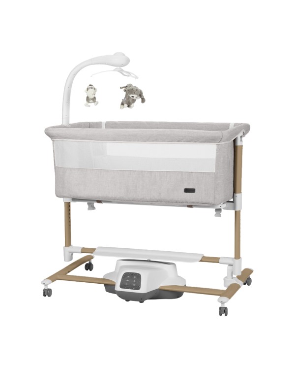 Cuna y mecedora 3 en 1 con ajuste de altura, control remoto para temporizador, modo balanceo y velocidad. La cuna ayuda a calmar al bebé y a mantenerlo dormido gracias a un sensor de movimiento integrado que activa el balanceo al ser molestado. Modo balanceo: La cuna ayuda a calmar al bebé y a mantenerlo dormido gracias a un sensor de movimiento integrado que activa el balanceo al ser molestado. Ajuste de altura: El colchón cuenta con 8 niveles de altura, que se seleccionan fácilmente mediante cómodas palancas. Esto permite colocar la cuna a la altura perfecta para alinearla con la cama de los padres. Lateral abatible: La cuna tiene un lateral abatible que permite usarla como cuna de cabecera para colecho. Incluye correas para sujetarla a la cama de los padres. Mosquitera: La cuna incluye una mosquitera para proteger al bebé de los insectos durante el verano. Utilizando el panel de control con indicadores luminosos o el mando a distancia, puedes seleccionar: * 7 modos de balanceo * 5 velocidades de balanceo * Temporizador de 8, 15 o 30 minutos Ajuste de altura (de arriba a abajo hasta el suelo): Posición 1: 80-48 cm Posición 2: 78-46 cm Posición 3: 76-44 cm Posición 4: 74-42 cm Posición 5: 72-40 cm Posición 6: 70-38 cm Posición 7: 68-36 cm Posición 8: 66-34 cm Se incluye un móvil electrónico con múltiples funciones: * Tres juguetes colgantes giratorios extraíbles * Proyector de luz nocturna con tres modos de iluminación